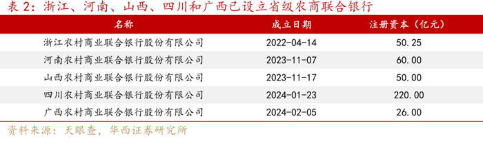继浙江农商联合银行成立之后,河南、山西、四川和广西也先后决定采用联合银行模式。2023年11月,河南农商联合银行和山西农商联合银行挂牌成立;2024年1月,四川农商联合银行成立;2024年2月,广西农商联合银行正式挂牌。与浙江农商联合银行“下参上”模式不同的是,河南、山西、四川和广西农商联合银行都采取了“上参下”模式,例如河南实行“省参市、市参县”,探索自上而下的逐级参股、控股。