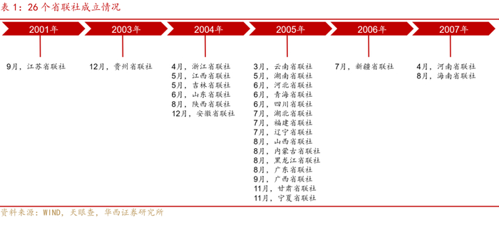 2001-2007年间,全国共26个省份设立了省联社,成立时间主要集中在2005年。2007年8月,全国最后一家省级联社——海南省联社挂牌成立,标志着这一阶段的农信机构改革工作基本完成,农信机构的两级法人体制得以实践。