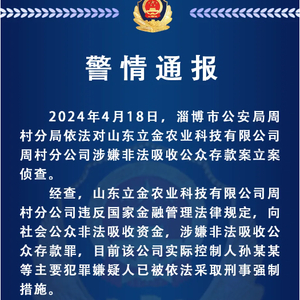4月20日、21日,淄博市公安局周村分局、淄博市公安局张店分局、淄博市公安局淄川分局分别发布警情通报,对山东立金农业科技有限公司相关分公司、代理点涉嫌非法吸收公众存款案立案侦查。