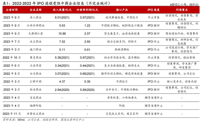 一方面,中药行业企业销售费用普遍较高,受到“反腐”影响较大。另一方面,据国投证券不完全统计,2022年来超过10家中药公司撤回IPO或终止IPO,还有3家公司IPO辅导备案终止,其中有6家公司收入体量超过5亿元。