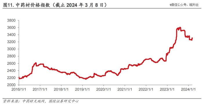 据中药材天地网和国投证券数据统计,2023年以来中药材价格经历了一轮显著的上涨(中药材价格指数从2023年初2800点涨到最高3500点),目前中药材价格依然处于历史高位;而中药材价格的居高不下,致使大量中药生产企业成本压力倍增。