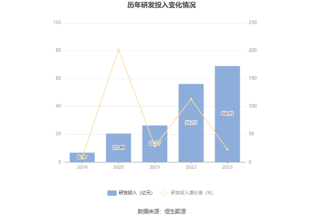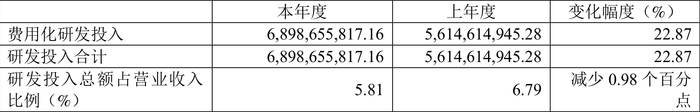 2023年全年,公司研发投入金额为68.99亿元,同比增长22.87%;研发投入占营业收入比例为5.81%,相比上年同期下降0.98个百分点。