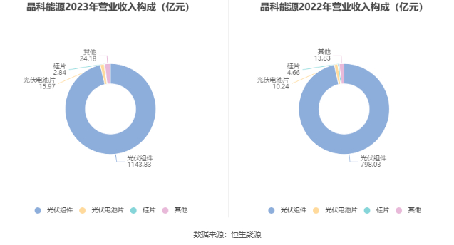 分产品来看,2023年公司主营业务中,光伏组件收入1143.83亿元,同比增长43.33%,占营业收入的96.38%;光伏电池片收入15.97亿元,同比增长55.99%,占营业收入的1.35%;硅片收入2.84亿元,同比下降39.18%,占营业收入的0.24%。