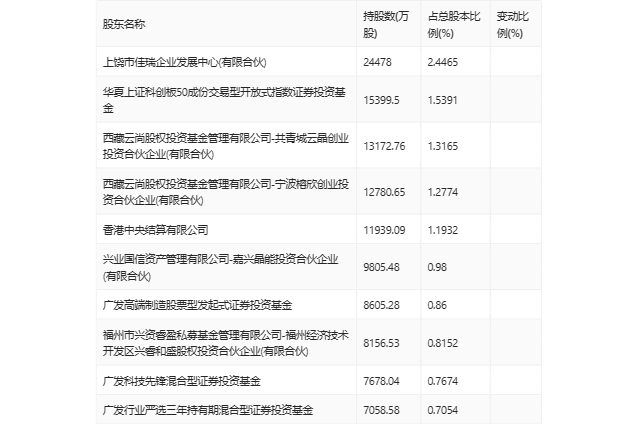 年报显示,2023年年末公司十大流通股东中,新进股东为上饶市佳瑞企业发展中心(有限合伙)、西藏云尚股权投资基金管理有限公司-共青城云晶创业投资合伙企业(有限合伙)、西藏云尚股权投资基金管理有限公司-宁波榕欣创业投资合伙企业(有限合伙)、兴业国信资产管理有限公司-嘉兴晶能投资合伙企业(有限合伙)、福州市兴资睿盈私募基金管理有限公司-福州经济技术开发区兴睿和盛股权投资合伙企业(有限合伙)、广发科技先锋混合型证券投资基金、广发行业严选三年持有期混合型证券投资基金。在具体持股比例上,香港中央结算有限公司持股有所上升,华夏上证科创板50成份交易型开放式指数证券投资基金、广发高端制造股票型发起式证券投资基金持股有所下降。