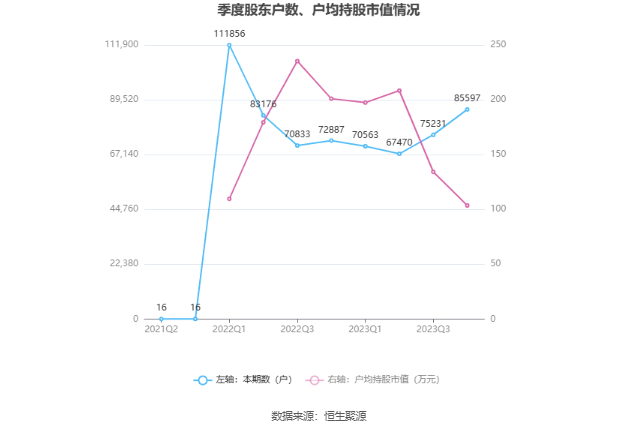筹码集中度方面,截至2023年年末,公司股东总户数为8.56万户,较三季度末增长了1.04万户,增幅13.78%;户均持股市值由三季度末的134.25万元下降至103.56万元,降幅为22.86%。