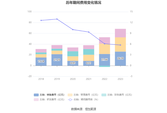 2023年,公司期间费用为68.27亿元,较上年同期增加17.81亿元;但期间费用率为5.75%,较上年同期下降0.35个百分点。其中,销售费用同比增长20.44%,管理费用同比增长38.27%,研发费用同比增长31.53%,财务费用由去年同期的-2.34亿元变为-626.00万元。