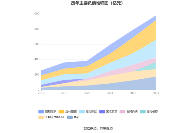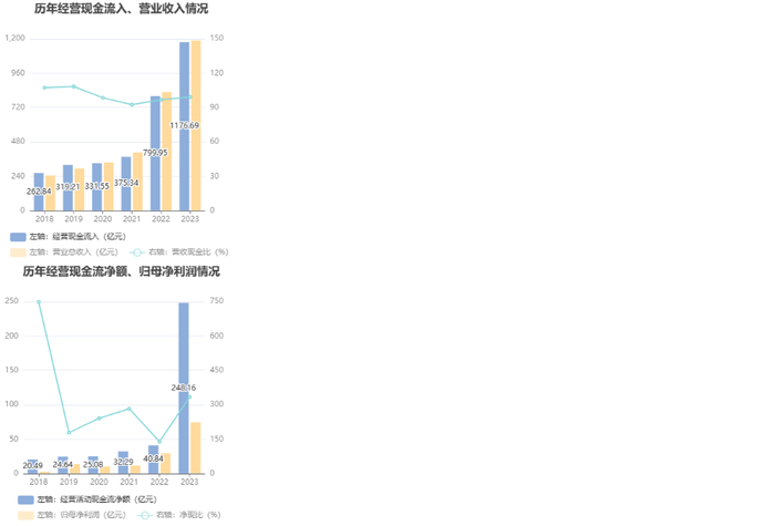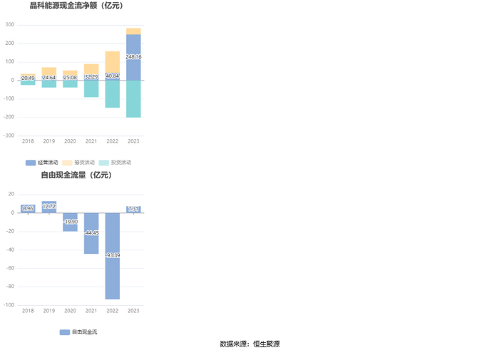 2023年,公司经营活动现金流净额为248.16亿元,同比增长507.62%,主要系报告期内收到的销货款增幅较大所致;筹资活动现金流净额34.34亿元,同比减少82.51亿元;投资活动现金流净额-201.28亿元,上年同期为-148.44亿元,主要系报告期内新建产能投资增加所致。