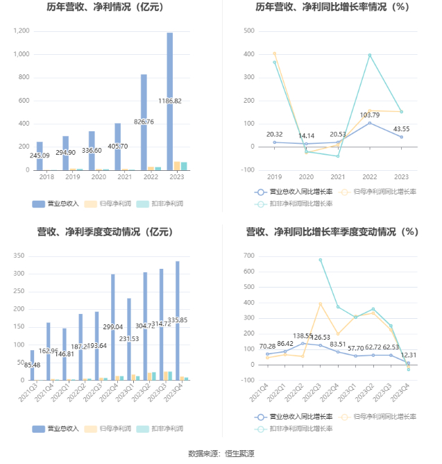 中证智能财讯 晶科能源(688223)4月23日披露2023年年报。2023年,公司实现营业总收入1186.82亿元,同比增长43.55%;归母净利润74.40亿元,同比增长153.20%;扣非净利润69.04亿元,同比增长152.09%;经营活动产生的现金流量净额为248.16亿元,同比增长507.62%;报告期内,晶科能源基本每股收益为0.74元,加权平均净资产收益率为24.19%。公司2023年年度利润分配预案为:拟向全体股东每10股派2.24元(含税)。