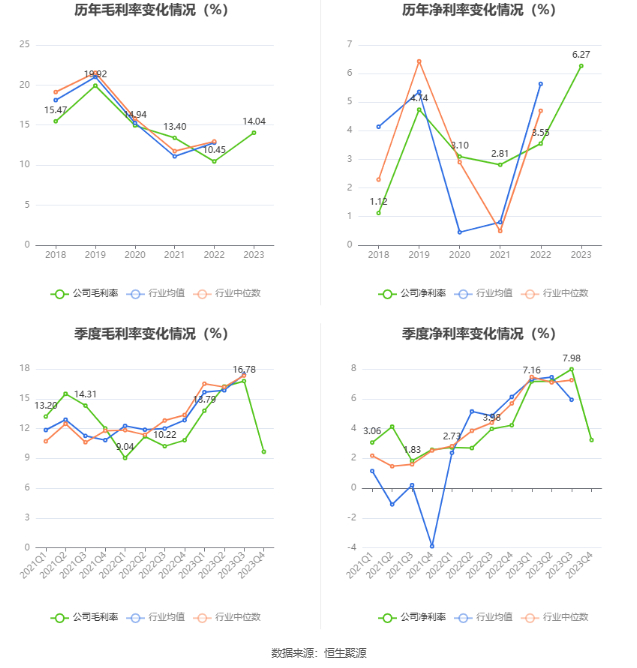 2023年,公司毛利率为14.04%,同比上升3.59个百分点;净利率为6.27%,较上年同期上升2.72个百分点。从单季度指标来看,2023年第四季度公司毛利率为9.66%,同比下降1.16个百分点,环比下降7.12个百分点;净利率为3.23%,较上年同期下降0.99个百分点,较上一季度下降4.75个百分点。