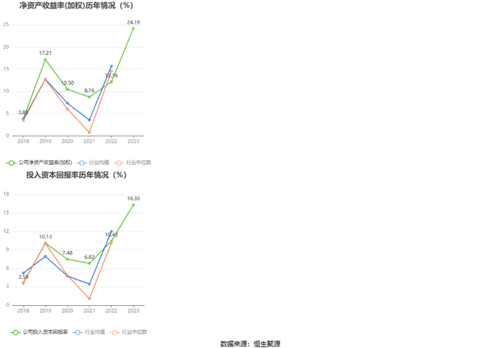 数据显示,2023年公司加权平均净资产收益率为24.19%,较上年同期增长12.03个百分点;公司2023年投入资本回报率为16.30%,较上年同期增长5.87个百分点。
