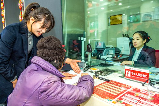 近年来,工行江西上饶信州支行围绕辖区老年群体需求,持续推进金融产品和服务适老化设施改造,开通老年人服务窗口,为老年群体提供全流程爱心服务。图为该行工作人员在热心辅助老年客户办理业务。本报记者 刘志良 摄