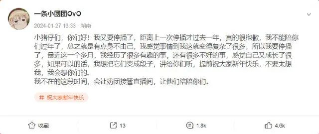 今年1月27日,一条小团团也在斗鱼鱼吧,发动态宣布停播,此后再无音讯。