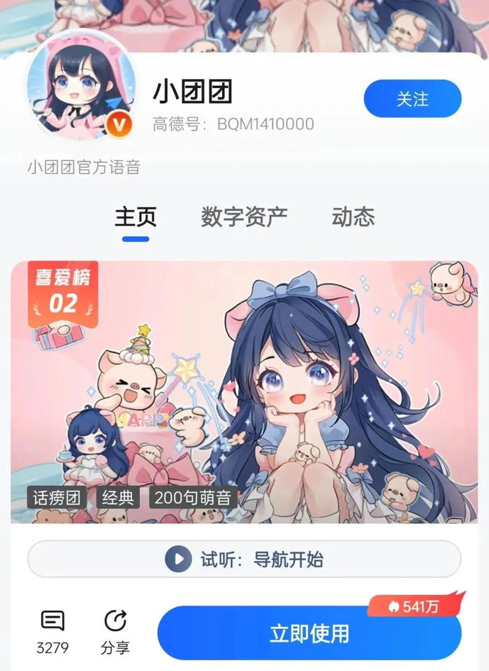 2020年9月,「小团团」导航语音上架高德地图,成为最受欢迎的导航语音包之一,用户量超千万。