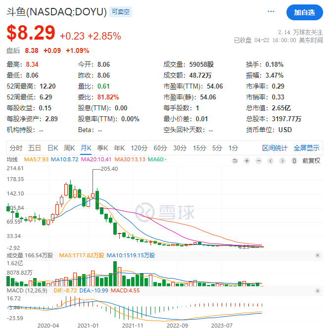 种种利空之下,自21年初斗鱼股价便不断走低,从最高的205.4美元,跌至8.29美元,总市值仅剩2.65亿美元。