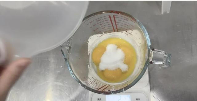 蛋黄中加入20g白砂糖并搅拌均匀