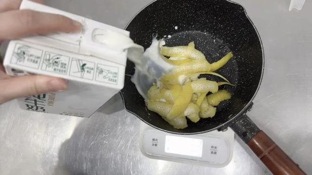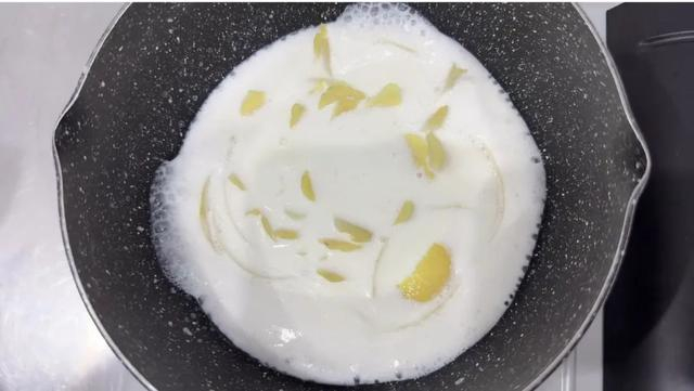 用小火将柠檬皮牛奶煮至微微冒泡