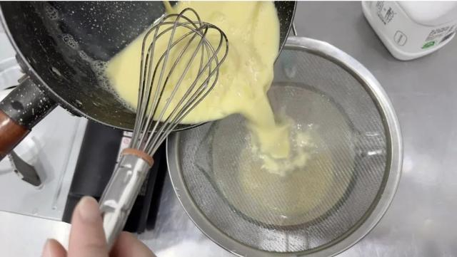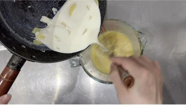 慢慢将柠檬皮牛奶倒入鸡蛋液中搅拌
