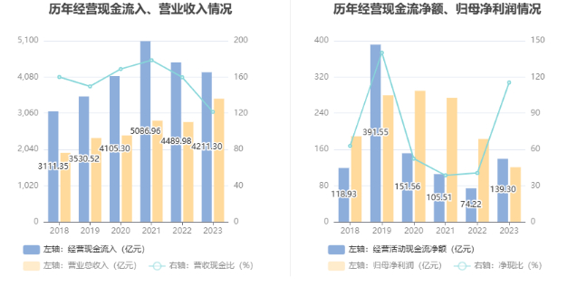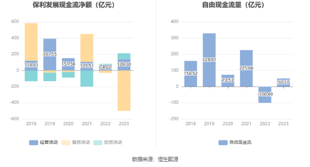 2023年,公司经营活动现金流净额为139.30亿元,同比增长87.68%;筹资活动现金流净额-499.62亿元,同比减少469.46亿元;投资活动现金流净额72.66亿元,上年同期为6.37亿元。