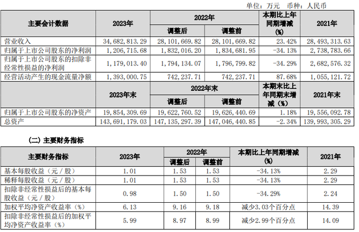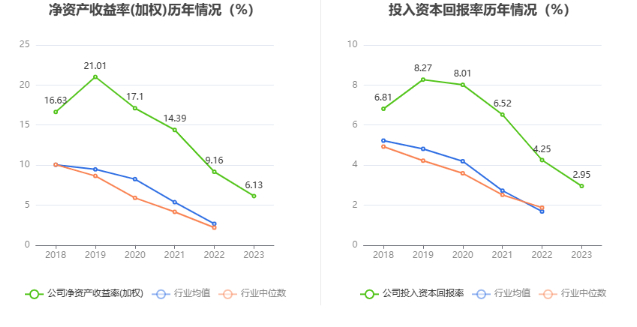 数据显示,2023年公司加权平均净资产收益率为6.13%,较上年同期下降3.03个百分点;公司2023年投入资本回报率为2.95%,较上年同期下降1.30个百分点。