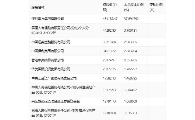 年报显示,2023年年末公司十大流通股东中,持股最多的为保利南方集团有限公司,占比37.69%。十大流通股东名单相比2023年三季报维持不变。在具体持股比例上,中国保利集团有限公司、中国人寿保险股份有限公司-传统-普通保险产品-005L-CT001沪、兴全趋势投资混合型证券投资基金持股有所上升,香港中央结算有限公司、华美国际投资集团有限公司持股有所下降。