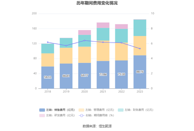 2023年,公司期间费用为185.13亿元,同比增长13.14亿元;但期间费用率为5.34%,同比下降0.78个百分点。其中,销售费用同比增长17.88%,管理费用同比增长8.75%,研发费用同比下降93.07%,财务费用同比增长19.12%。