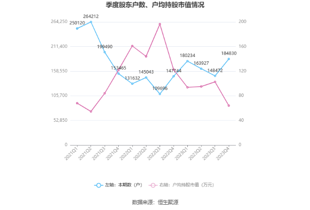 筹码集中度方面,截至2023年年末,公司股东总户数为18.48万户,较三季度末增长了3.64万户,增幅24.49%;户均持股市值由三季度末的102.72万元下降至64.12万元,降幅为37.58%。