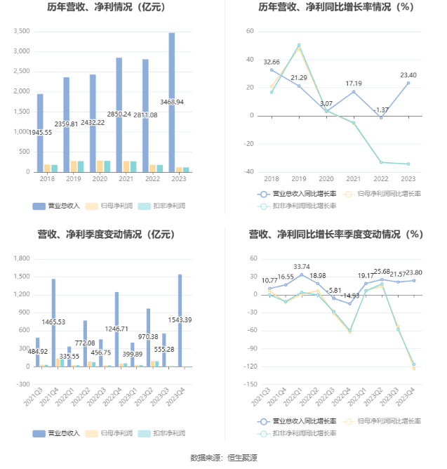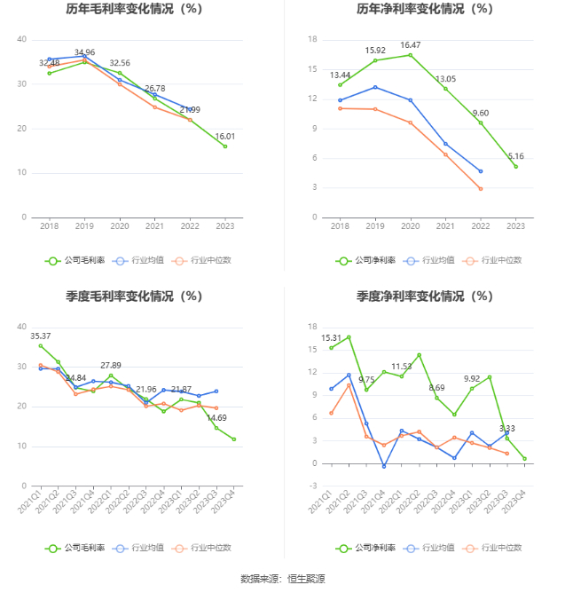 2023年,公司毛利率为16.01%,同比下降5.98个百分点;净利率为5.16%,较上年同期下降4.44个百分点。从单季度指标来看,2023年第四季度公司毛利率为11.82%,同比下降7.04个百分点,环比下降2.87个百分点;净利率为0.64%,较上年同期下降5.84个百分点,较上一季度下降2.69个百分点。