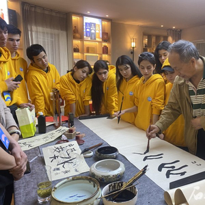 茶艺馆还专门邀请书法师为营员们讲授中国书法。书法师介绍了中国传统书法知识,指导大家正确的执笔方法、书写姿势和章法。国家一级书法师赵福生还现场书写了“中巴友谊万岁”送给来自巴基斯坦的学生。