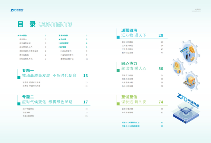 本次报告聚焦“推动高质量发展 不负时代使命” “应对气候变化 纵贯绿色邮路”两大专题,从递联四海、同心协力、至诚至信三大篇章,展现中通携手员工、客户、合作伙伴、社区等利益相关方共同传递“用我们的产品造就更多人的幸福”的企业使命,系统全面地介绍了2023年中通快递在企业社会责任践行方面的重要举措及各项成果。