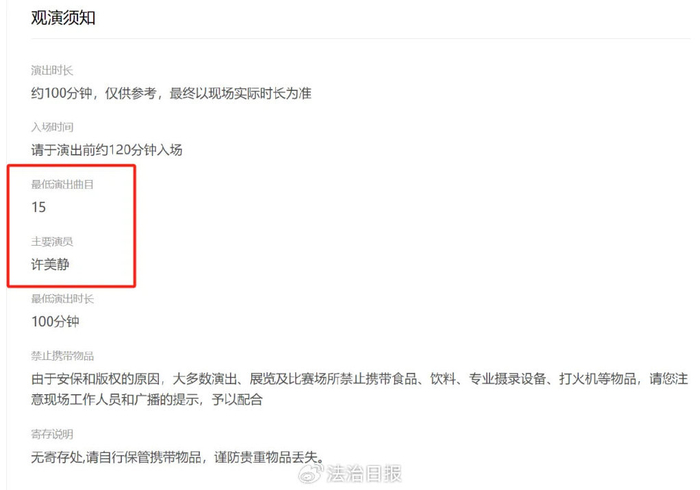 据悉,演唱会曲目列表中,收录了多首许美静的经典作品,如《遗憾》《城里的月光》等。