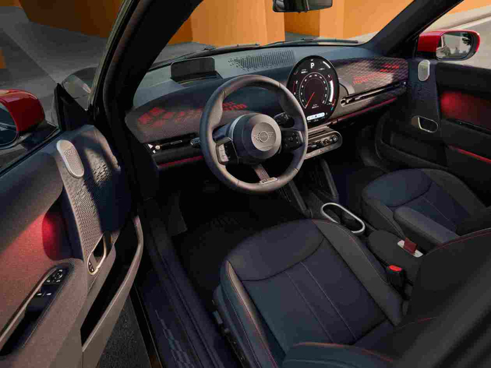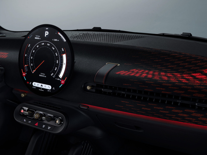 “极简至上”的MINI品牌设计哲学在全新电动MINI Cooper车内得到忠实再现。在当年的经典Mini上,设计师仅保留三个基本元素——方向盘、圆形中央显示屏、拨杆开关,构成了车内最纯粹的设计,大胆,简约。如今,全新电动MINI Cooper的前排区域设计充分致敬这一纯粹风格,以同样仅有的三项基本元素,生动诠释“迷你至简”的特质。