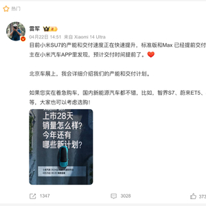 近日小米集团董事长雷军发微博称,目前小米SU7的产能和交付速度正在快速提升,标准版和Max已经提前交付,并且会在北京车展上详细介绍小米的产能和交付计划。