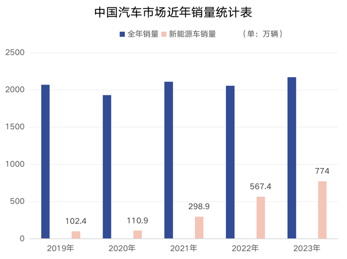 乘联会数据显示,2023年全国累计乘用车销量为2170.3万辆,保持5.6%的增长,但综合业绩与2018年水平基本持衡。异军突起的是新能源车市场。2019年中国市场全年新能源车销量仅102.4万辆,2023年突破774万辆。