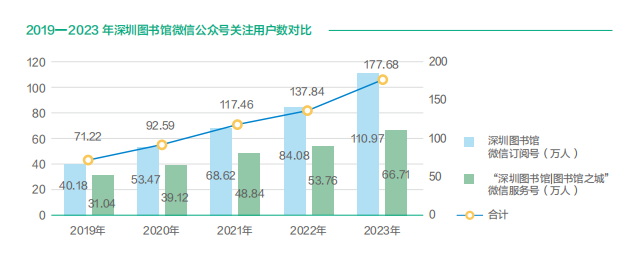 2023年,深圳图书馆全媒体服务矩阵拓展升级,微信微博等新媒体平台关注用户数累计236万,读者通过微信利用图书馆服务达937.54万人次、5274.69万页次,微博阅读量达1.14亿人次。“深图首发”新书分享活动创新开展,“方志里的深圳”古籍智慧化开发与活化利用项目入选文旅部“智慧图书馆创新应用优秀案例”,“书香湾区 触手可得”数字阅读创新推广系列活动入选“深圳读书月”主推项目。