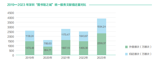 2023年,文献外借量2298.37万册次,文献归还量1594.24万册次,同比分别增长56.75%、52.75%,双创历史新高;异地还书量311.88万册次,在2家及以上图书馆借阅过文献的读者有39.26万人,均达历史峰值,统一服务效能凸显;外借读者人均借阅量34册次,年度外借量最多的读者借阅文献2857册次,再创新纪录;18~44岁读者外借量占比超6成,0~12岁读者人均借阅量41册,位列各年龄段榜首。
