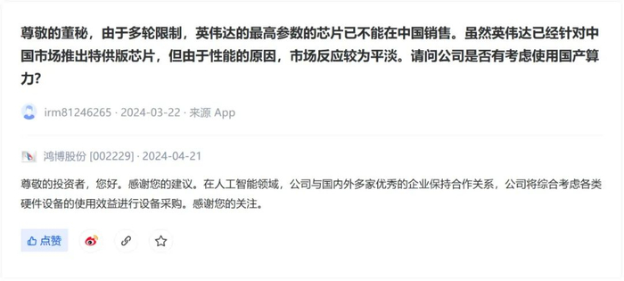 面对投资者“公司有考虑支持国产算力,远离国外算力”“英伟达针对中国市场推出特供版芯片,由于性能的原因市场反应较为平淡”等犀利问题时,鸿博股份也只给出了“公司与国内外多家优秀的企业保持合作关系”“将综合考虑各类硬件设备的使用效益进行设备采购”的回复。