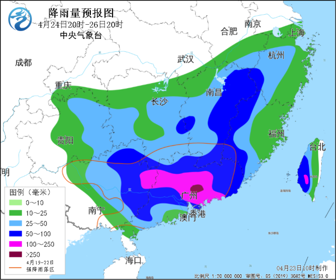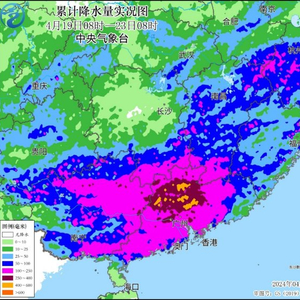 中央气象台监测显示,19日以来,广东、广西中东部、湖南南部、江西南部、浙江西南部等地累计降雨量有100~150毫米,广东中北部、广西东部等地200~350毫米,广东肇庆、清远、韶关、广州、惠州等局地400~519毫米;截至23日早晨,广东、广西共17个国家气象观测站日雨量突破4月极值。