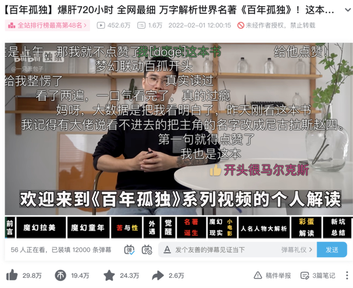 如B站UP主一只萧包子创作的“《百年孤独》系列合集”,将晦涩难懂,人物图谱复杂的故事,讲述得通俗易懂。截至目前,全系列收获了992.1万的总阅读,最高单篇点赞达到了29.8万,收获大量用户催更,“看不懂的《百年孤独》终于看懂了,希望作者能以此为例将《巴黎圣母院》等作品逐一进行解读”。