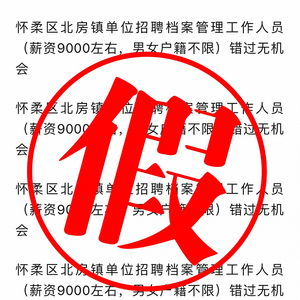 4月23日,北京市怀柔区北房镇人民政府官微“渔阳北房”发文,近日,有网络用户在自媒体平台发布虚假内容,以“北房镇单位”名义招聘档案管理工作人员。对此,北房镇政府郑重声明:北房镇政府招聘编外工作人员,均通过北京市人力资源网发布招聘公告,招聘公告由区人保局审核通过后才能进行发布。请市民朋友加强防范、提高警惕,谨防上当受骗。如已造成损失,请及时向公安机关报案。