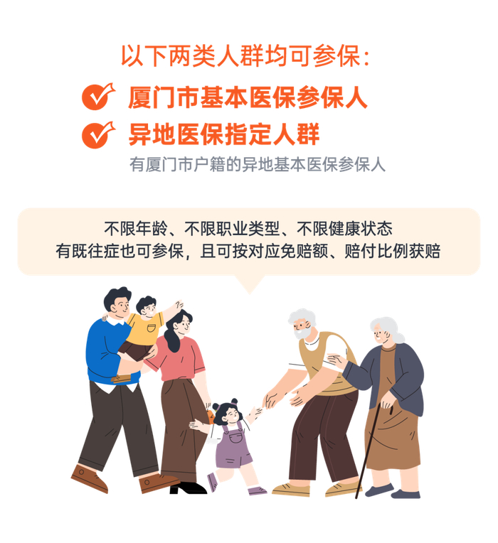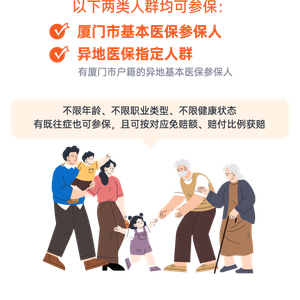 凡是厦门市基本医保参保人以及拥有厦门市户籍的异地基本医保参保人均可参保,无年龄、职业类型、健康状况等限制,无需体检、有既往症也可参保,且可按对应免赔额、赔付比例获赔。