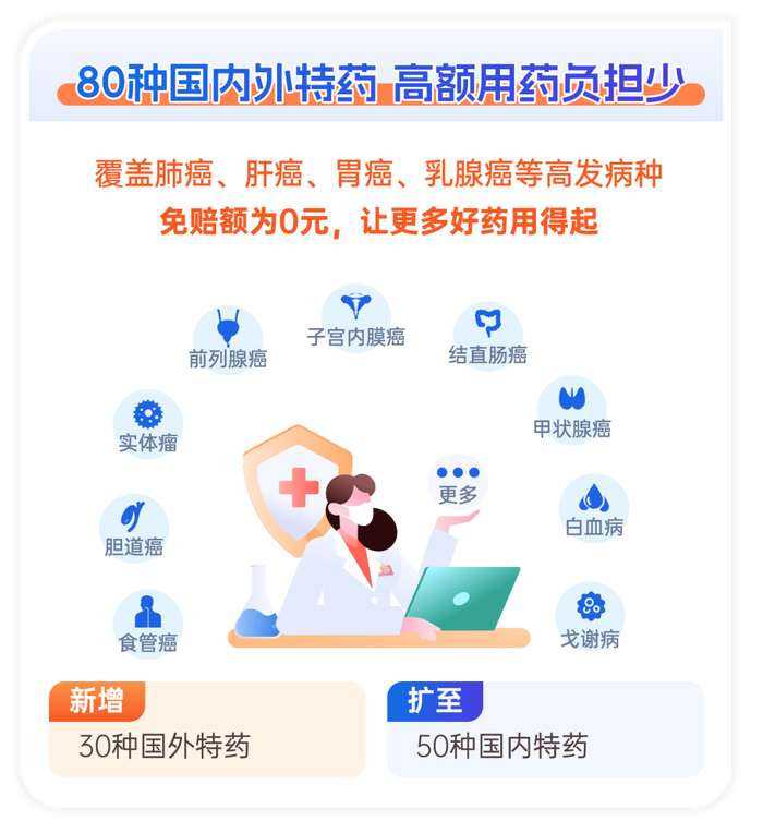 国内特药数量从原来37种增至50种,同时引入国际优质医药服务,新增30种海外特药,药品覆盖肺癌、肝癌、胃癌、乳腺癌等高发病种,老百姓不出国门就能用上昂贵特效药,所有特药0免赔。