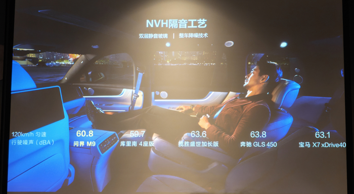 如果说动力性能、底盘悬架的表现是符合其50万级的价格,那么它的静谧性则是越级领先,给了笔者很大的惊喜,其在时速120km/h行驶时噪音仅60.8分贝,如果你对这个数据没有明确概念,那么我再列举一下百万级的奔驰GLS、宝马X7、路虎揽胜他们的噪音值超过63分贝,劳斯莱斯库里南噪音值低至59.7分贝,问界M9仅次于劳斯莱斯库里南。