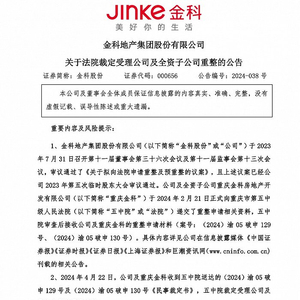 4月22日晚间,金科股份发布公告称,该公司收到重庆市第五中级人民法院送达的(2024)渝05破申129号及(2024)渝05破申130号《民事裁定书》,法院裁定受理金科股份的重整申请。