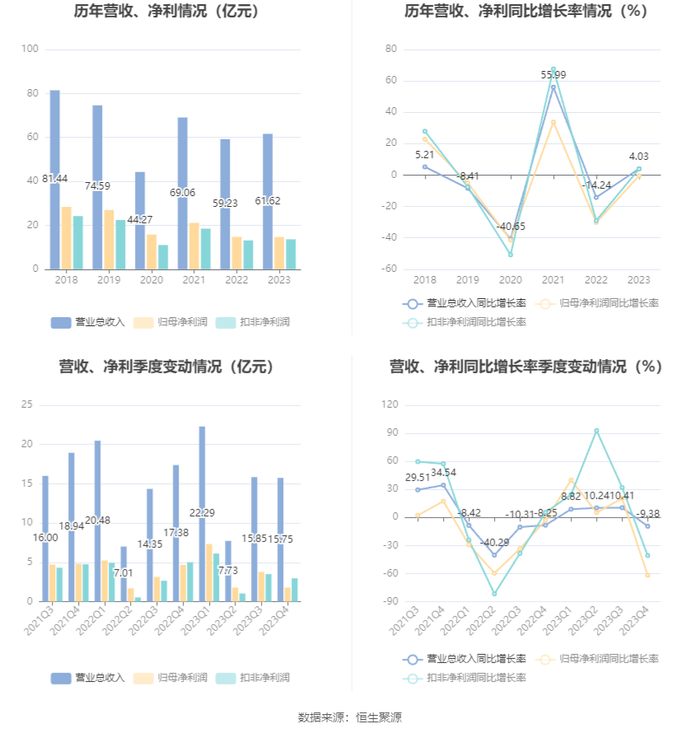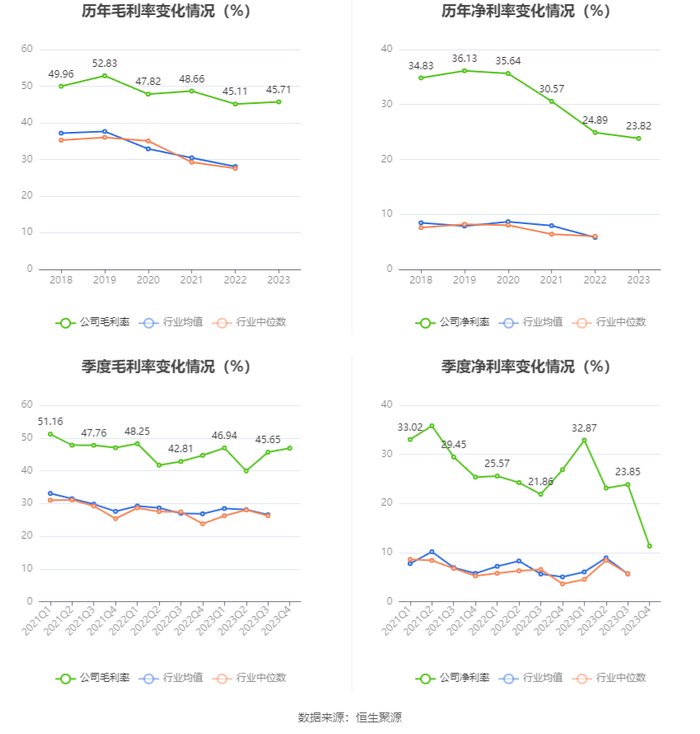 2023年,公司毛利率为45.71%,同比上升0.60个百分点;净利率为23.82%,较上年同期下降1.07个百分点。从单季度指标来看,2023年第四季度公司毛利率为46.88%,同比上升2.20个百分点,环比上升1.23个百分点;净利率为11.30%,较上年同期下降15.56个百分点,较上一季度下降12.55个百分点。