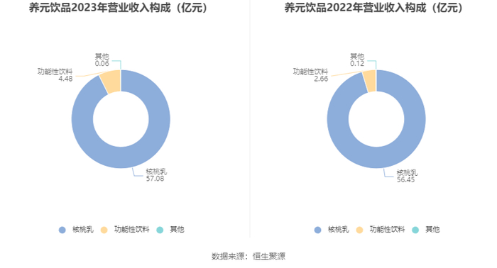 分产品来看,2023年公司主营业务中,核桃乳收入57.08亿元,同比增长1.11%,占营业收入的92.63%;功能性饮料收入4.48亿元,同比增长68.24%,占营业收入的7.27%。