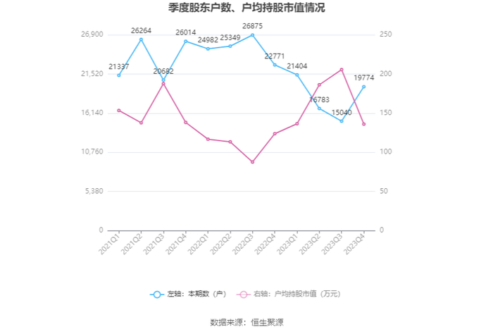 筹码集中度方面,截至2023年年末,公司股东总户数为1.98万户,较三季度末增长了4734户,增幅31.48%;户均持股市值由三季度末的205.64万元下降至136.06万元,降幅为33.84%。