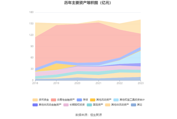 资产重大变化方面,截至2023年年末,公司交易性金融资产较上年末减少52.92%,占公司总资产比重下降27.61个百分点;其他权益工具投资合计较上年末增加239.27%,占公司总资产比重上升13.87个百分点;货币资金较上年末增加133.12%,占公司总资产比重上升12.53个百分点;其他非流动金融资产较上年末增加114.65%,占公司总资产比重上升2.67个百分点。