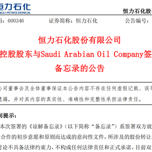 4月22日晚间,恒力石化发布公告称,公司控股股东恒力集团已与沙特阿拉伯国家石油公司(Saudi Arabian Oil Company,简称“沙特阿美”,2222.SE)签署了《谅解备忘录》,达成了相关股权投资、商业合作的初步意向文件。