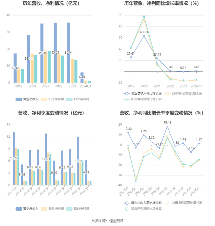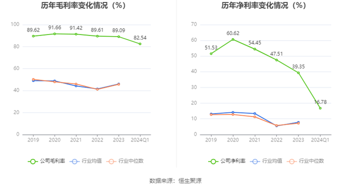 2024年第一季度,公司毛利率为82.54%,同比上升0.14个百分点;净利率为16.78%,较上年同期下降3.26个百分点。