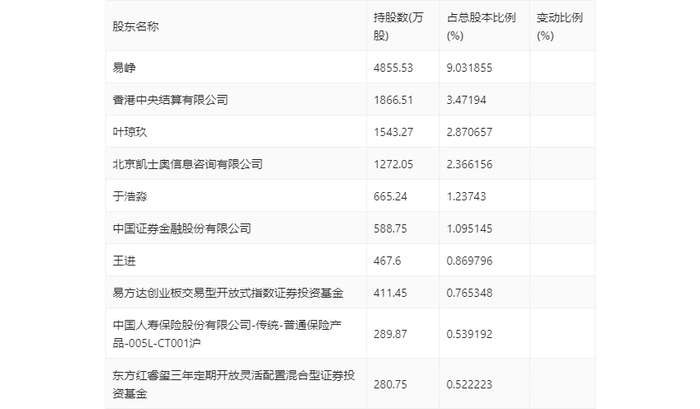 一季报显示,2024年一季度末公司十大流通股东中,持股最多的为易峥,占比9.03%。十大流通股东名单相比null年年报维持不变。在具体持股比例上,香港中央结算有限公司、北京凯士奥信息咨询有限公司、王进、易方达创业板交易型开放式指数证券投资基金、中国人寿保险股份有限公司-传统-普通保险产品-005L-CT001沪持股有所上升,东方红睿玺三年定期开放灵活配置混合型证券投资基金持股有所下降。